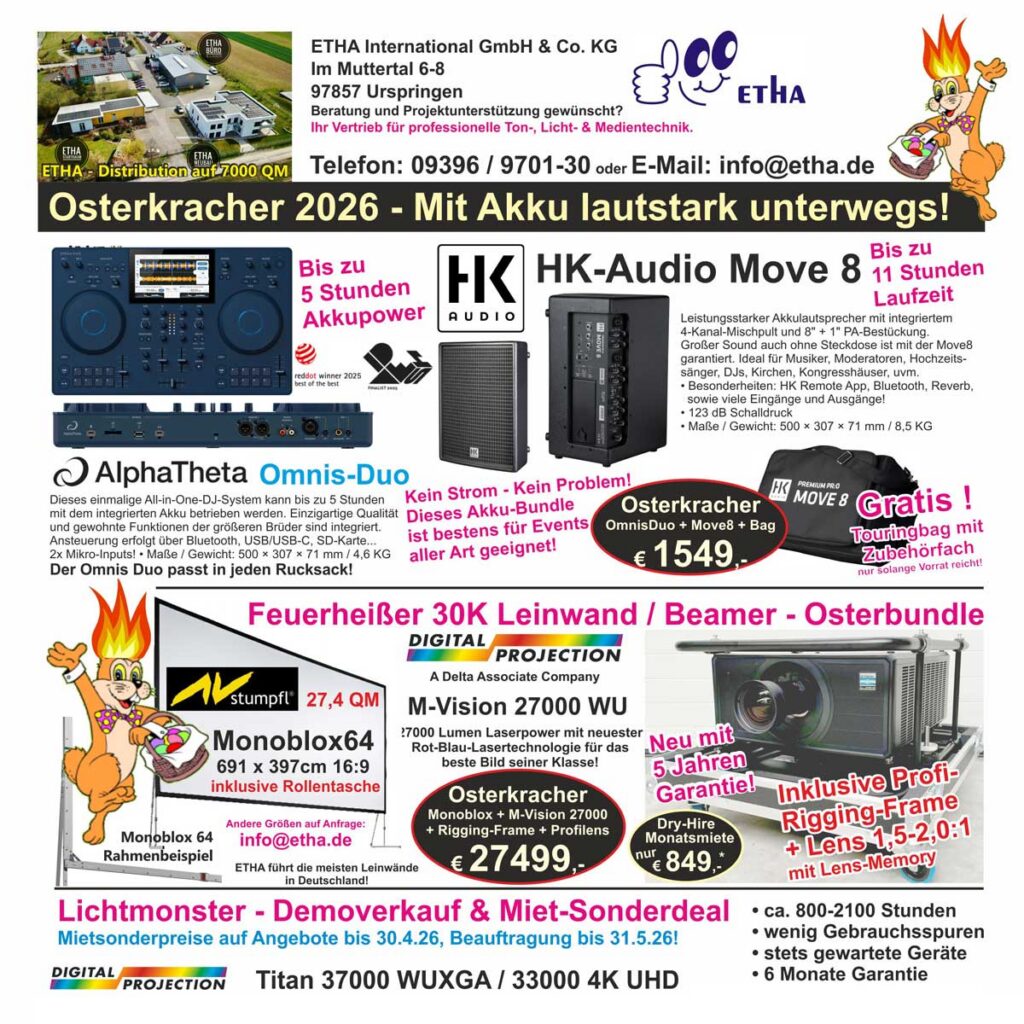 Der Frühling steht vor der Tür Und wir bei ETHA haben das Nest für Sie bereits prall gefüllt! Pünktlich zur Saison 2026 präsentieren wir Ihnen exklusive Bundles und Angebote, bei denen selbst dem Osterhasen zu heiß wird und mit denen Sie bei Ihren Kunden garantiert für Begeisterung sorgen. 🔋 Mobil & Lautstark: Der „Osterkracher“ für […]