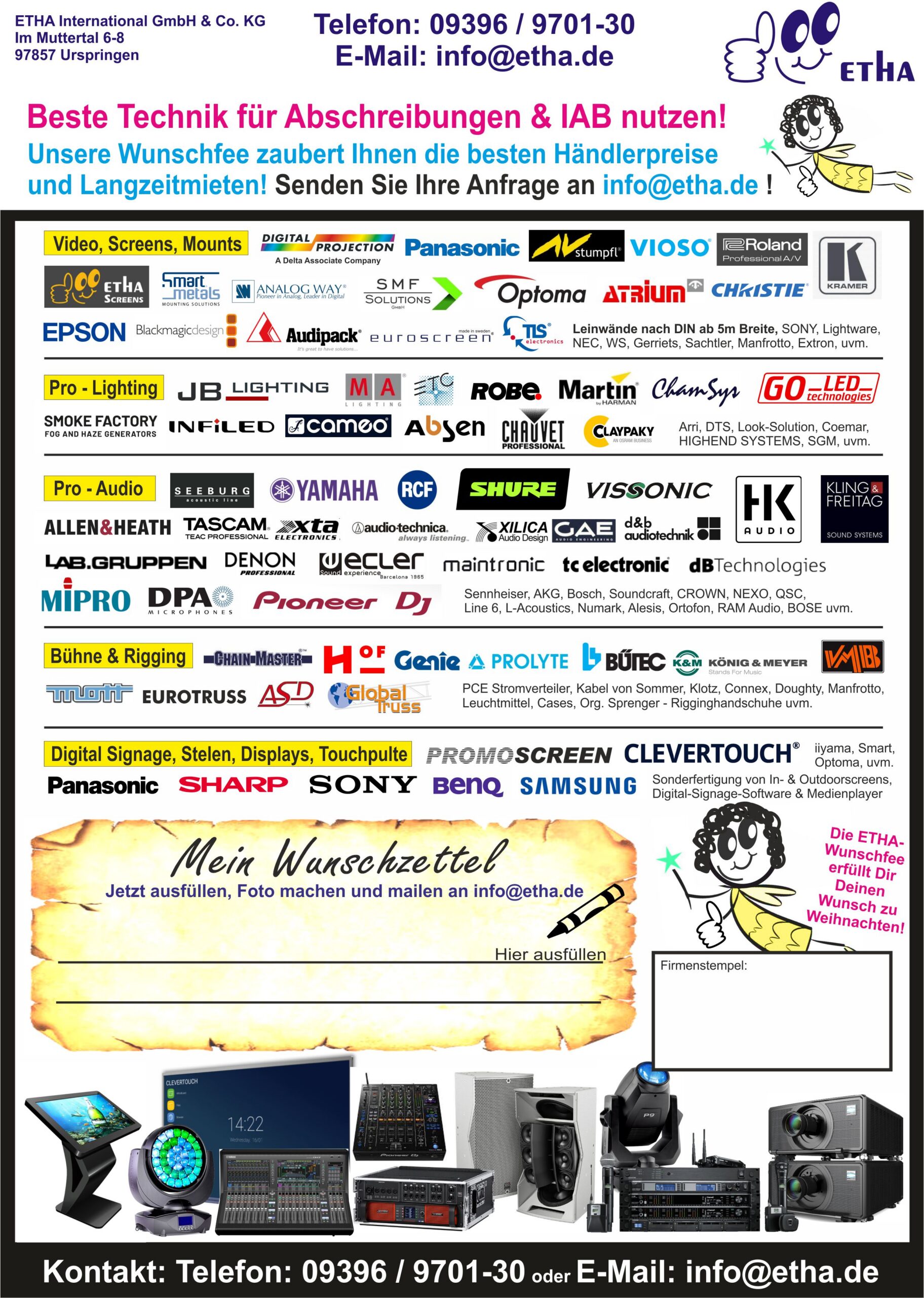 Sie suchen gerade nach neuen Techniklösungen aus dem Bereich der Medien- & Veranstaltungstechnik? Ich hoffe, ich konnte Ihnen einen kleinen Einblick geben, welche Produkte und Marken Sie sehr günstig bei ETHA kaufen können und gleichzeitig als Kunde auf extrem günstige Mietpreise für Großprojektoren und ausgewählte Scheinwerfer von JB-Lighting zugreifen können. Kontaktieren Sie uns unter 09396 / 9701-30 oder senden Sie uns einfach Ihre Anfrage per Email an info@etha.de