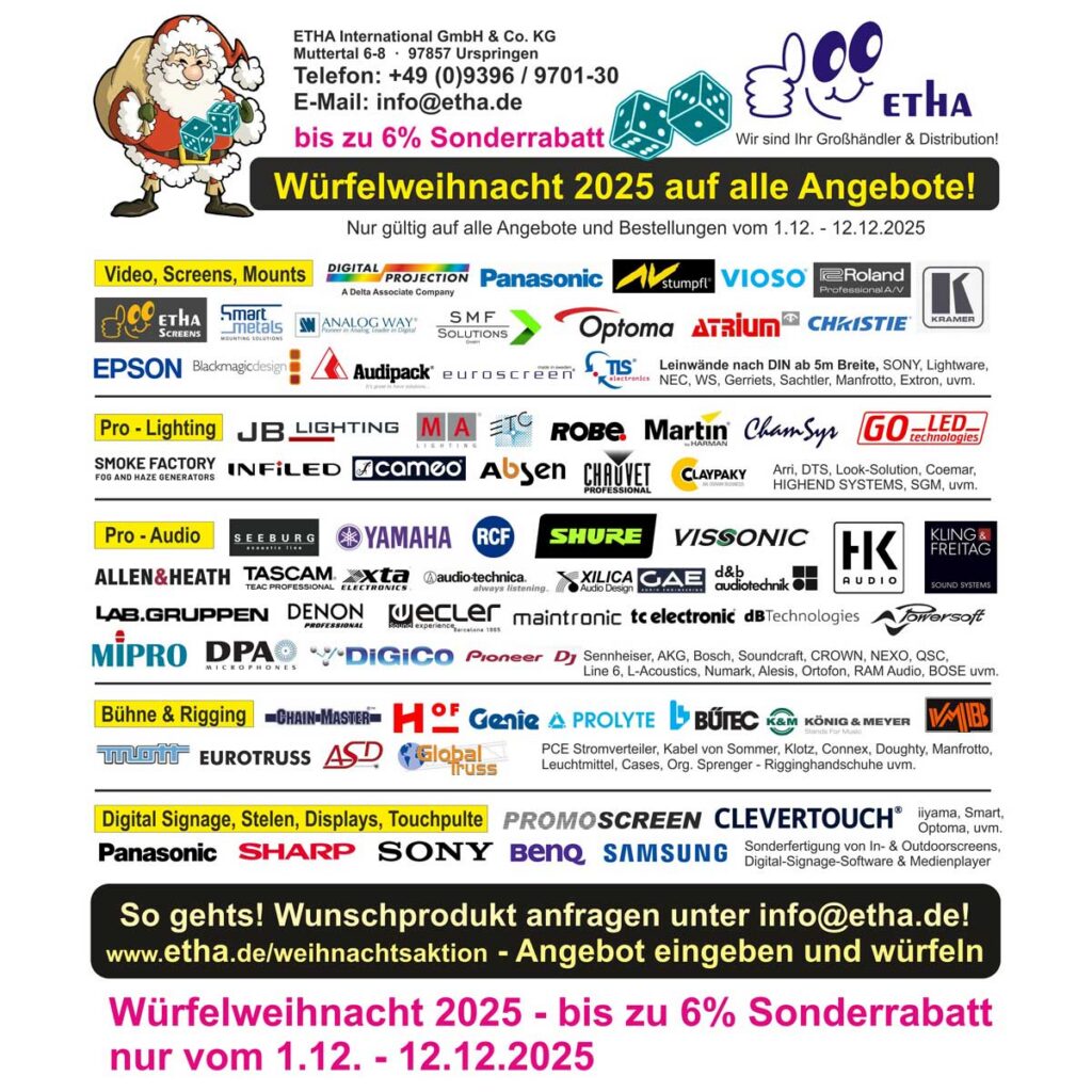 Heute präsentiert unsere Wunschfee: Steueroptimierungen mit bester Technik für Ihr Business Yamaha DM3 – Tio1608 Bundle-Deal für Händler Leistungsstarke Hochleistungsprojektoren zum unschlagbaren Preis im Demoabverkauf Einladung: Di. 4.11.- Do. 6.11.25 Unit(Ed)ucation Days Stadttheater Aschaffenburg: FoH, Monitor, Beschallung Drei Tage geballtes Know-how für alle, die in der Praxis mehr rausholen wollen, mit unseren Marken DiGiCo, […]