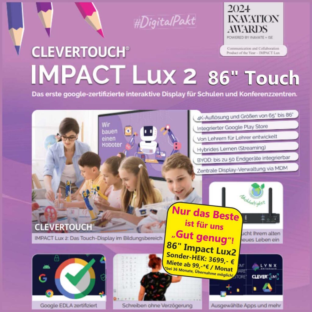XXL-Technik für Ihre Meetings und Klassenräume Clevertouch IMPACT Lux 2 86“ Touch-Display zum Vorzugspreis! Bereits zu Zeiten von Corona konnten Schulen, die von ETHA und unseren Clevertouch-Regio-Partnern mit Clevertouch-Tafel-Systemen ausgestattet wurden, auf Homescooling umstellen und Konferenzzentren ihre Meetings digital über die integrierten Techniklösungen von Clevertouch abhalten und in aller Welt streamen. Clevertouch ist seiner Zeit voraus. […]