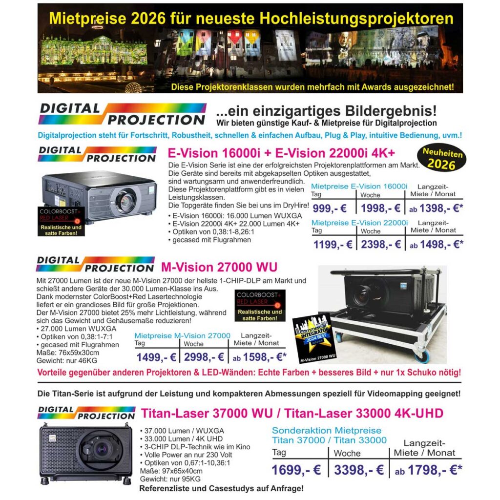 Aufgrund aktueller Umstellungen in unserem Verkaufs-, Demo- und Miet-Projektorenpool, auf die neuen Hochleistungsprojektoren mit Nexustechnology, welche Video-Mapping und Softwareeinstellungen vereinfachen und gleichzeitig noch höhere Betriebssicherheit bieten, sende ich Ihnen als ausgewählter Partner unsere neue Mietpreisliste für das Jahr 2026. Unser Service für Sie: Bestandskunden erhalten ebenfalls einen Nachlass auf bestehende Angebote und Aufträge!   Neue […]