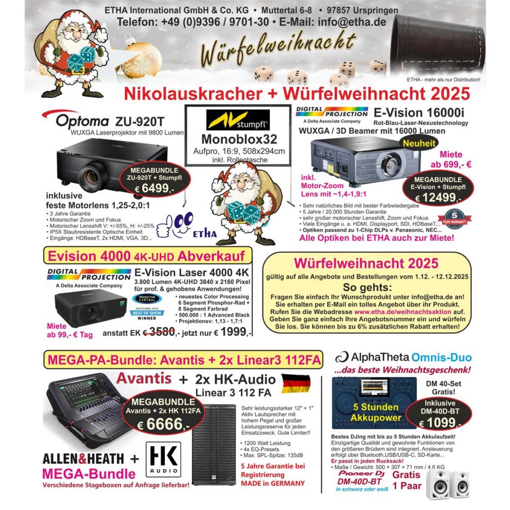Heute präsentiert unsere Wunschfee: Steueroptimierungen mit bester Technik für Ihr Business Yamaha DM3 – Tio1608 Bundle-Deal für Händler Leistungsstarke Hochleistungsprojektoren zum unschlagbaren Preis im Demoabverkauf Einladung: Di. 4.11.- Do. 6.11.25 Unit(Ed)ucation Days Stadttheater Aschaffenburg: FoH, Monitor, Beschallung Drei Tage geballtes Know-how für alle, die in der Praxis mehr rausholen wollen, mit unseren Marken DiGiCo, […]