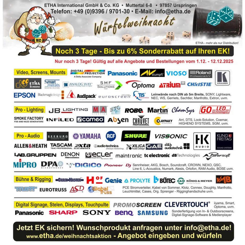 Reminder: Würfelweihnacht 2025 endet am Freitag den 12.12.25 Bis Freitag 12.12.25 können Sie auf Ihre Angebote und Einkaufspreise zusätzlich bis zu 6% Sonderrabatte würfeln. So einfach geht es! Sie suchen professionelle Produkte aus der Medien- und Veranstaltungstechnik & möchten auf Beratung und Support nicht verzichten? Aufgrund des Rentalpools kann ETHA auch einen Support anbieten, welchem definitiv […]