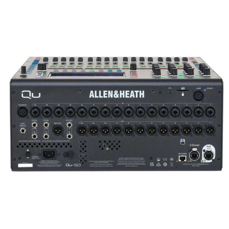 Neben den analogen Anschlüssen bietet der Qu-5D moderne digitale Schnittstellen. Über USB-A und SD-Karte können Stereo- und Multitrack-Aufnahmen mit bis zu 96 kHz/24 Bit durchgeführt und direkt auf dem Mischpult gespeichert werden. Die USB-C-Schnittstelle ermöglicht zudem die Mehrkanal-Audioübertragung und MIDI-Steuerung am Computer. Das optionale SLink-System erlaubt die Anbindung weiterer I/O-Expander, ME-Personal-Monitoring-Systeme und die Vernetzung mit anderen Allen & Heath Geräten.