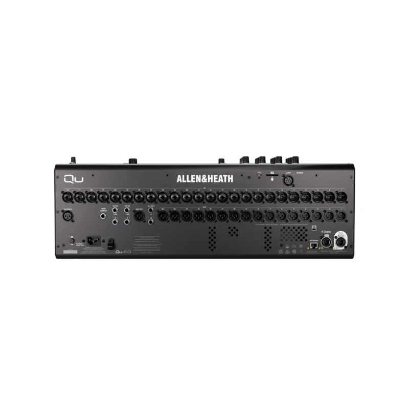 Mit insgesamt 38 Eingangskanälen, darunter 32 Mono oder linkbare Kanäle sowie 3 Stereo-Eingänge, bietet der Qu-6D ausreichend Flexibilität für verschiedenste Audioquellen. Die 24 XLR/Jack Kombi-Buchsen mit voll digital steuerbaren Vorverstärkern liefern eine Verstärkung von bis zu +60 dB und ermöglichen somit den Anschluss von Mikrofonen und Line-Signalen mit höchster Präzision. Zusätzlich sind zwei Stereo Line-Eingänge, ein XLR-Talkback-Anschluss und 16 XLR-Ausgänge vorhanden. Für die digitale Audioübertragung verfügt das Gerät über einen AES3 Stereoausgang sowie einen 16×16 Dante-Interface-Port, der nahtlose Integration in professionelle Dante-Netzwerke erlaubt.