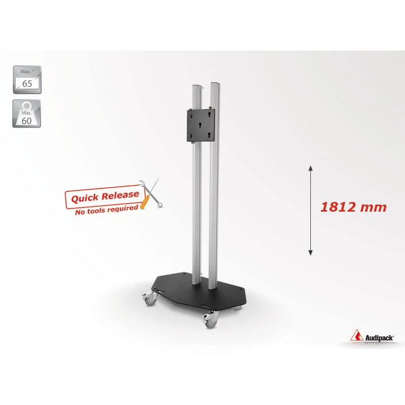 Der Flachbildschirm-Bodenständer mit Rollen (Höhe 1800 mm) aus der Audipack 700 Serie ist eine professionelle Lösung für alle, die maximale Flexibilität, Mobilität und Stabilität in einem System benötigen. Entwickelt für Flachbildschirme bis 65 Zoll und einem maximalen Gewicht von 60 kg, eignet sich dieses Modell ideal für den Einsatz bei Präsentationen, Veranstaltungen, Messen oder im Verleihbereich.