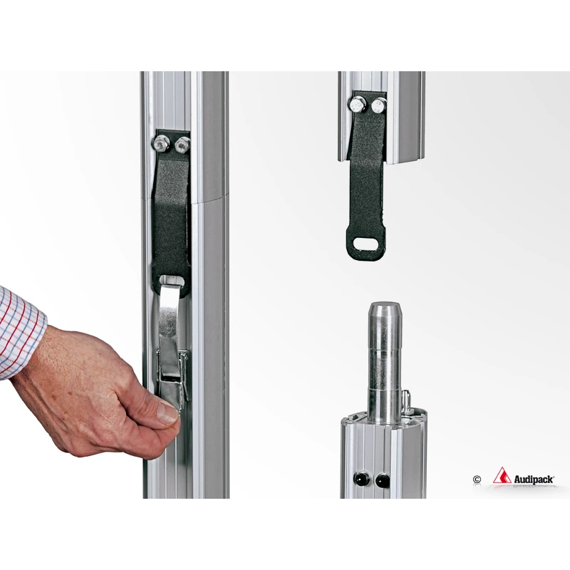 Ein weiteres zentrales Feature ist das bewährte Lock&Secure-Schnellverschluss-System (3- und 5-Punkt-Verriegelung), das eine werkzeuglose Montage ermöglicht. Der Aufbau erfolgt schnell, einfach und sicher – ein großer Vorteil für Verleihfirmen oder Anwender, die häufig zwischen verschiedenen Einsatzorten wechseln. Die stufenlos vertikal verstellbare Bildschirmposition sorgt zusätzlich für maximale Flexibilität und erlaubt eine optimale Anpassung an unterschiedliche Präsentationssituationen und Zuschauerhöhen.