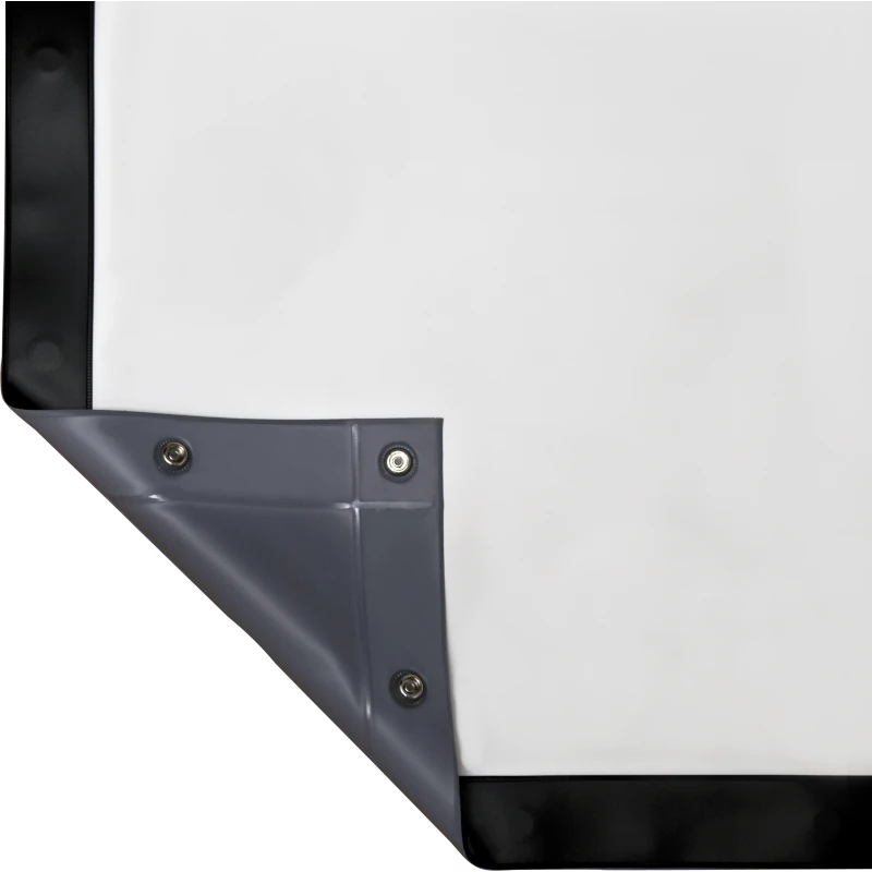 Die im Lieferumfang enthaltene Aufprojektionsfolie mit umlaufendem 10 cm schwarzem Rand ist speziell für die Frontprojektion optimiert. Die matte, nahtlose Oberfläche gewährleistet eine homogene Lichtverteilung über die gesamte Bildfläche. Der schwarze Rand verbessert zusätzlich die wahrgenommene Bildschärfe und den Kontrast, indem er eine klare visuelle Abgrenzung schafft. Die Befestigung erfolgt über ein präzises Druckknopfsystem, das eine gleichmäßige Spannung sicherstellt und so Faltenbildung verhindert.