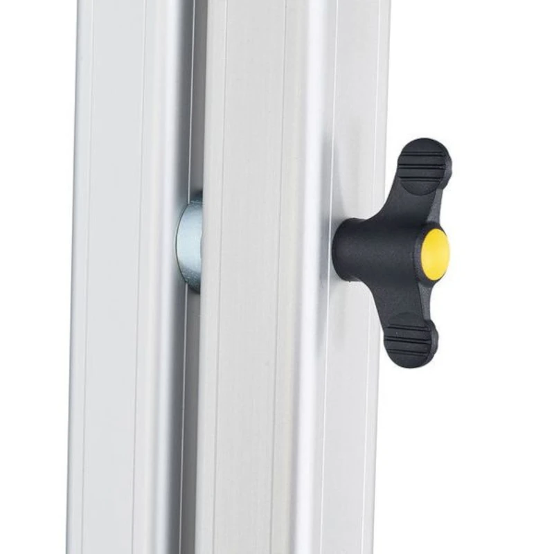Der aus gehärteter Aluminiumlegierung gefertigte Rahmen verbindet hohe Stabilität mit möglichst geringem Gewicht. Die horizontalen Rahmenelemente sind mit der patentierten Schnappgelenktechnologie ausgestattet. Sie ermöglichen ein besonders kompaktes Transportmaß und einen schnellen Aufbau: Beim Auseinanderziehen rasten die Gelenke automatisch ein und bringen das Rahmenelement in seine stabile Endposition. Die Eckmodule werden aufgeklappt und nehmen die Vertikalteile auf, die exakt auf das WUXGA-Format 16:10 abgestimmt sind. Für andere Formate – beispielsweise 4:3 oder 16:9 – können die Vertikalmodule einfach ausgetauscht werden, ohne dass ein komplett neuer Rahmen erforderlich ist. Die Verbindung erfolgt mittels Flügelschrauben, die im mitgelieferten gelben Schraubenbeutel organisiert sind.