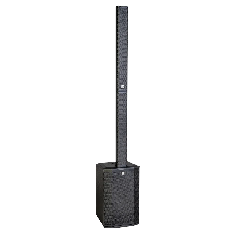 Herzstück des Systems ist der aktive Subwoofer im Bassreflex-Gehäuse, der mit einem 12″ Konuslautsprecher ausgestattet ist. Dieses Tieftonkonzept ermöglicht eine druckvolle und präzise Basswiedergabe. Der Übertragungsbereich reicht bis 35 Hz (-10 dB) und sorgt damit für eine solide Tieftonbasis, auch bei anspruchsvollen Musikstilen. Die integrierte Frequenzweiche arbeitet mit Hoch- und Tiefpässen von jeweils 24 dB/Oktave und stellt eine saubere Trennung zwischen Subwoofer und Säulenelement sicher. Das Subwoofergehäuse besteht aus Multiplex-Holz mit Acryllackierung und ist mit zwei Griffen sowie einem beschichteten Stahlgitter ausgestattet, was sowohl Stabilität als auch Transportsicherheit gewährleistet.