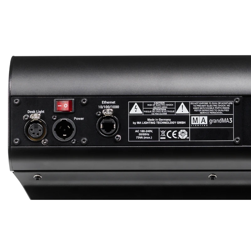 Anschlussseitig bietet die grandMA3 extension alle wichtigen Schnittstellen, die für eine moderne Lichtsteuerung erforderlich sind. Dazu gehören ein powerCON TRUE1 Anschluss für die stabile Stromversorgung sowie ein etherCON/RJ45 Anschluss für die Netzwerkverbindung mit der Hauptkonsole. Für die Beleuchtung des Bedienplatzes steht eine LED Pultleuchte mit 4pin XLR Anschluss zur Verfügung.