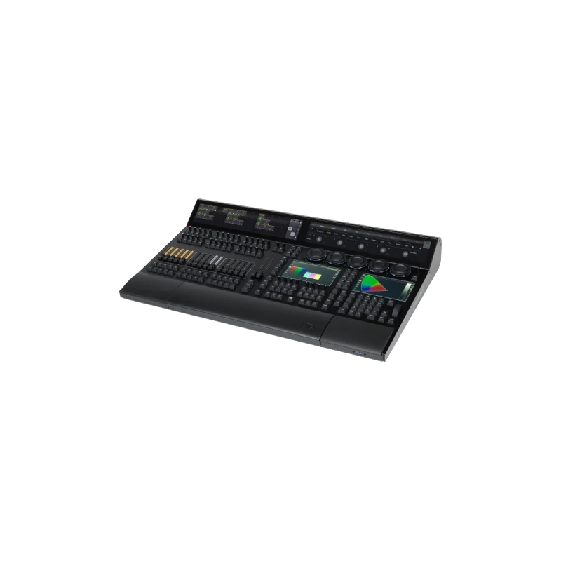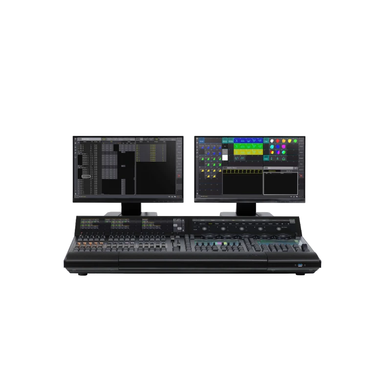 Die Hardware bietet eine ausgewogene Kombination aus Übersichtlichkeit, Performance und Bedienkomfort. Zwei interne Letterbox-Monitore sowie zwei Command-Touchscreens ermöglichen eine kontextsensitive Anzeige von Parametern, Playbacks, Encoder-Funktionen und Systeminformationen. Zusätzlich sind 60 physikalische Playbacks, 15 motorisierte 60 mm Fader, 2 motorisierte A/B 100 mm Fader, 16 frei belegbare x-Tasten, 41 RGB-hinterleuchtete Encoder und 5 Dual Encoder verbaut. Diese Kombination bietet dem Operator ein intuitives und direktes Arbeiten – mit schneller Reaktionszeit und maximaler Übersicht.