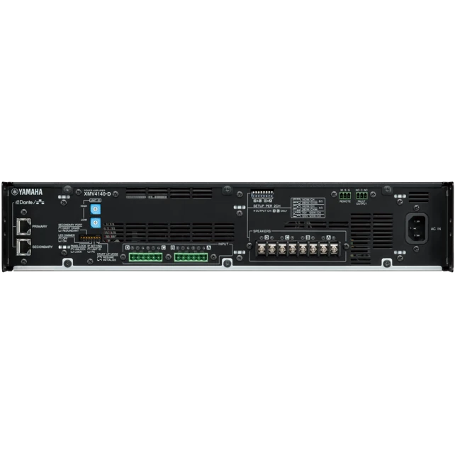 Ein herausragendes Merkmal des XMV4140-D ist die integrierte Dante™ Audio-Netzwerktechnologie von Audinate. Über die beiden RJ45-Anschlüsse (Primary und Secondary) lässt sich der Verstärker nahtlos in ein Dante-Netzwerk integrieren. Audiosignale werden digital, verlustfrei und mit minimaler Latenz über Standard-Ethernet-Kabel übertragen. Die Unterstützung von redundanten Netzwerkverbindungen erhöht die Ausfallsicherheit erheblich und macht den XMV4140-D besonders attraktiv für professionelle Installationen mit hohen Anforderungen an Zuverlässigkeit und Betriebssicherheit. Der Verstärker kann direkt mit Dante-fähigen Mischpulten, Signalprozessoren, weiteren Endstufen oder Ausgabegeräten verbunden werden.