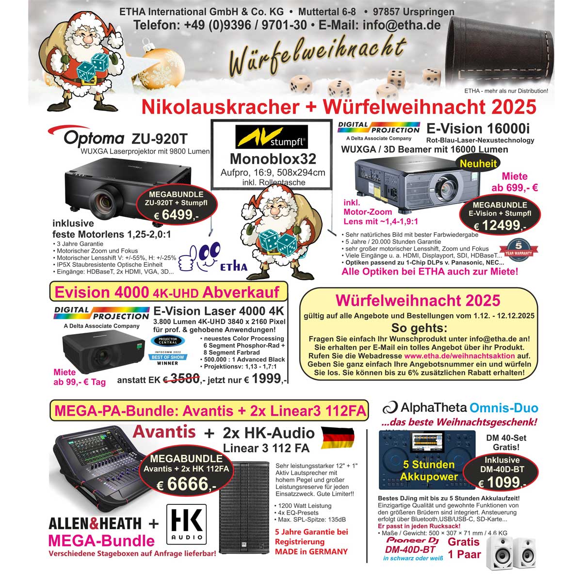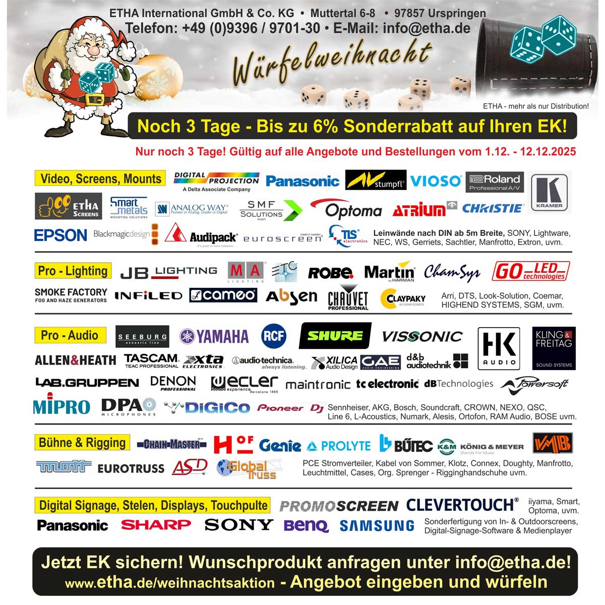 Reminder: Würfelweihnacht 2025 endet am Freitag den 12.12.25 Bis Freitag 12.12.25 können Sie auf Ihre Angebote und Einkaufspreise zusätzlich bis zu 6% Sonderrabatte würfeln. So einfach geht es! Sie suchen professionelle Produkte aus der Medien- und Veranstaltungstechnik [...]